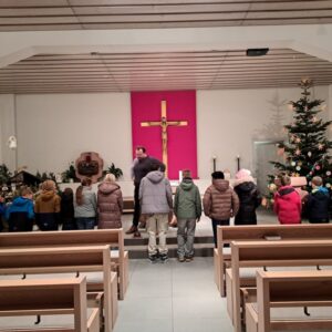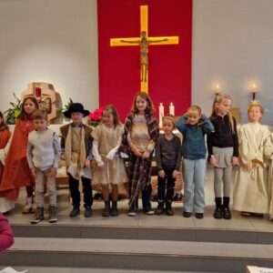 Die 14 Krippenspiel Kinder ließen an Heiligabend das Weihnachtsevangelium lebendig werden. Das Stück handelte davon, wie Opa und Oma den Kindern die Weihnachtsgeschichte erzählen, um ihnen die Wartezeit aufs Fest…
