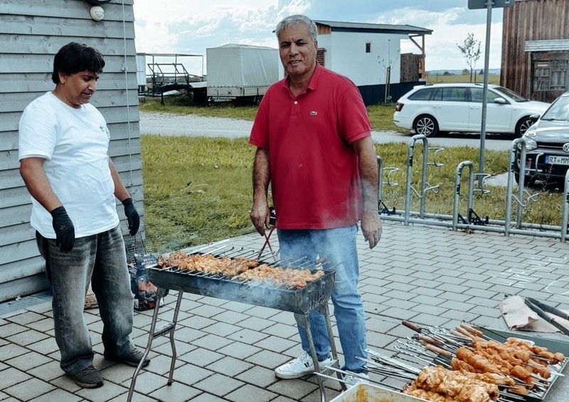 Shuhaib und Mahmoud sind die Grillmaster, sie verstehen es hervorragend, die Hähnchenteile gut zu marinieren und zu grillen. Gemeinsam mit schwäbischen und arabischen Beilagen wird der Tag zu einem richtigen Geschmackserlebnis.