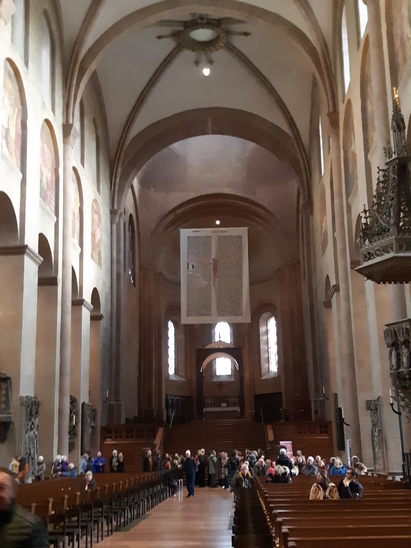 Im Mittelpunkt des Tages stand die Besichtigung des imposanten Mainzer Doms St. Martin, eines der bedeutendsten Bauwerke romanischer Kirchenarchitektur in Deutschland. Der Dom wurde um das Jahr 975 unter Erzbischof Willigis begonnen und im Laufe der Jahrhunderte mehrfach umgebaut und erweitert. Der eng mit dem ottonischen Kaiserhaus verbundene Erzbischof hatte sich als einer der ranghöchsten Würdenträger nach dem Papst und dem Kaiser Macht und Einfluss erworben. Mit dem monumentalen Dom Bau unterstrich Willigis seine protokollarische und politische Bedeutung in der Kirche und im Reich. Entgegen der üblichen Kirchengestaltung wurde der Hauptaltar nicht im Osten, sondern im Westen aufgestellt. Diese bis heute unveränderte Ausrichtung entspricht der Anordnung des Papstaltars im alten Petersdom in Rom.