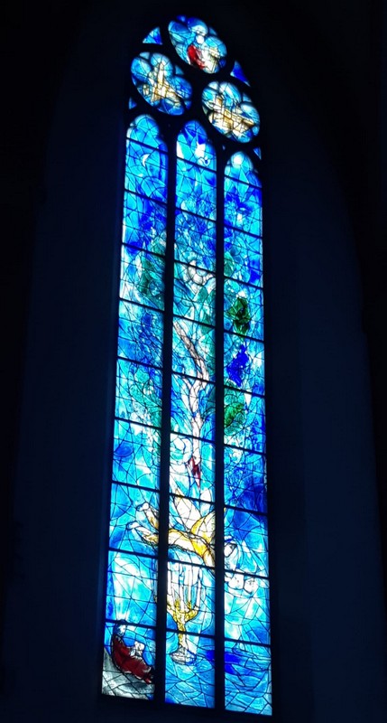 Danach sind wir zur Kirche Sankt Stephan gelaufen. Dort haben wir die Kirchenfenster angeschaut. Die hat Marc Chagall gemacht, als er 93 Jahre alt war. Marc Chagall ist ein sehr berühmter Künstler. Seine Lieblingsfarbe war blau. Die Fenster haben mir sehr gefallen.
