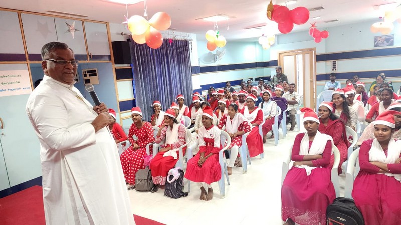 „Die Dalitmädchen, für die Sie eine Patenschaft übernommen haben, sind sehr hilfsbedürftige Menschen. Fast alle haben familiäre Probleme. Die meisten haben keine Eltern, die für sie sorgen (können), d. h. sie sind entweder Alkoholiker oder arbeitslos oder als Kuli beschäftigt. Kinder mit solchem Familienhintergrund können normalerweise nicht in die Schule gehen, sondern schuften in Fabriken. Daher ist Ihre Hilfe etwas Besonderes und Bedeutsames. Die Mädchen bekommen Selbstvertrauen, setzen Hoffnung in ihre Fähigkeiten und erfahren konkret, dass sie etwas leisten KÖNNEN. Das ist nur möglich dank Ihrer Unterstützung. Unsere Organisation und unser Bistum zusammen mit unserem Erzbischof Dr. S. Antonysamz bedanken sich daher ganz herzlich für Ihre liebe Zuwendung. Die Mädchen und ihre Eltern beten für ihre Paten, dass es ihnen immer gut gehen möge. Sie wünschen euch allen ein gnadenreiches Weihnachtsfest und ein glückseliges Neujahr 2026.