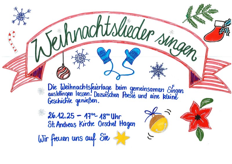 Weihnachtslieder erzählen auf wunderbare Weise von der Botschaft des Mensch gewordenen Gottes. Sie erzeugen eine Atmosphäre und Stimmung, die einzigartig ist. Gerne möchten wir Sie einladen am zweiten Weihnachtsfeiertag, Freitag, 26. Dezember 2025 um 17.00 Uhr in der St. Andreas Kirche, bekannte und unbekannte Weihnachtslieder zu genießen.