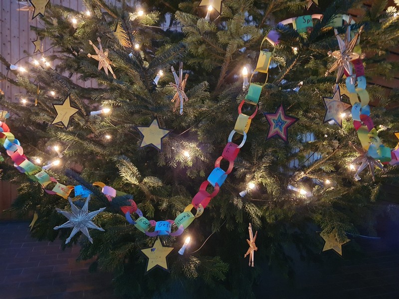 Unsere Weihnachtsbäume in den Kirchen zeigen „Sternstunden“, der Kommunionkinder mit dem, was Freude macht und wo sie ganz erfüllt sind mit guten und schönen Erlebnissen, wo sie die Welt um sich herum vergessen können. Und eine Kette mit all dem, was sie entdeckten, wo sie dankbar sind.
