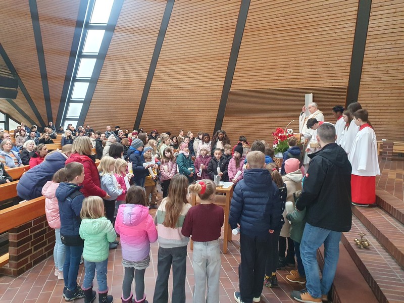 Zum Familiengottesdienst am 11.01. 26 in der St Andreas Kirche brachten viele Kinder ihre Taufkerze mit. Die Taufe Jesu war Anlass, sich auch an die eigene Taufe zu erinnern. Die verschiedenen Symbole der Taufe, das Wasser, der Chrisam, die Taufkerze und das Taufkleid wurden zunächst gezeigt und ihre Bedeutung erklärt.