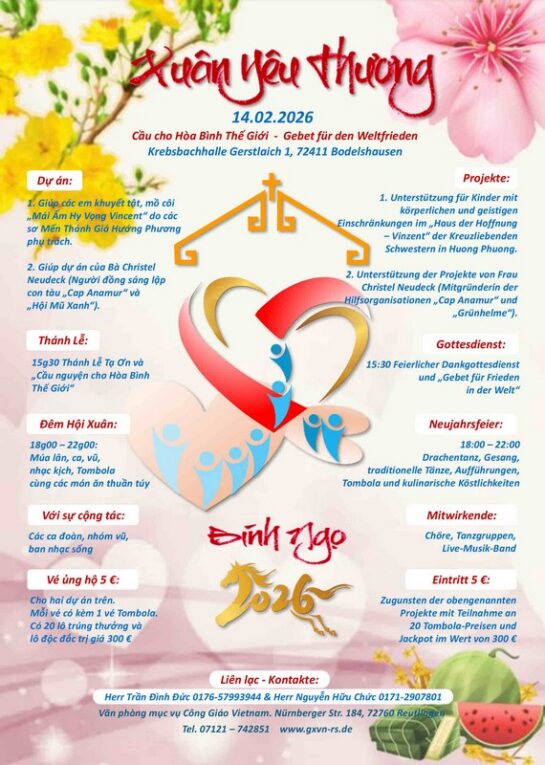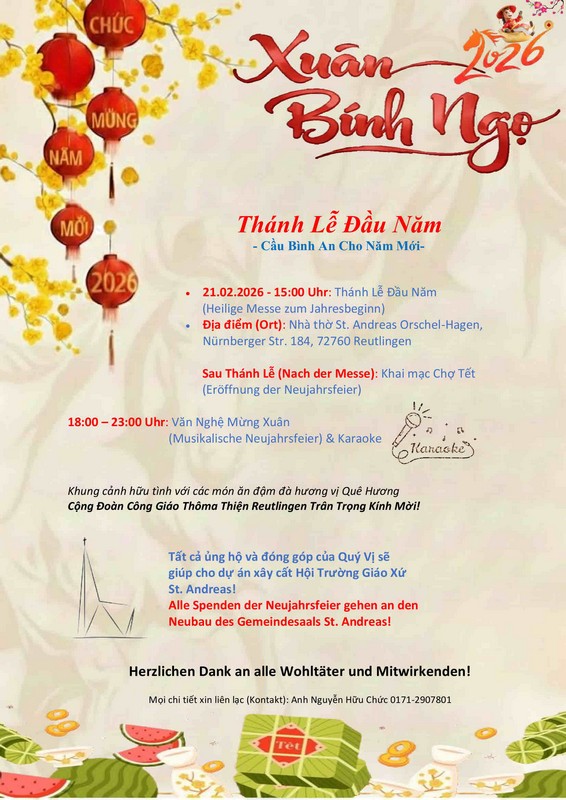 Am Samstag, 21. Februar 2026 um 15.00 Uhr feiert die Vietnamesische Gemeinde ihr Neujahrsfest nochmals in St. Andreas. Auch hierzu sind Sie herzlich eingeladen.