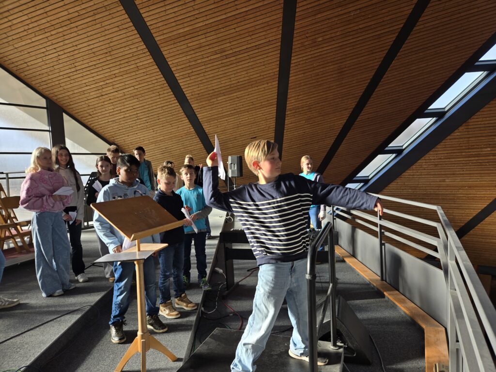 Ein besonderes Highlight war der Papierflieger-Wettbewerb: Zunächst bauten alle Minis ihre eigenen Papierflieger, bevor es zum Weitwurf-Wettbewerb kam. Der Startpunkt befand sich auf der Empore der Kirche. Während die besten Flieger bis in den Altarraum segelten, flogen einige der weniger gelungenen Exemplare nach hinten und beinahe aus der Kirche hinaus – zur allgemeinen Erheiterung der Teilnehmenden.
