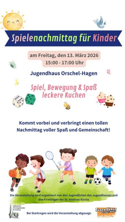 Am Freitag, den 13. März 2026, laden die Firmlinge und das Jugendhaus-Team alle Kinder herzlich zu einem fröhlichen Spielenachmittag ein. Von 15.00 bis 17.00 Uhr gibt es viele tolle Spiele, Spaß, Bewegung.