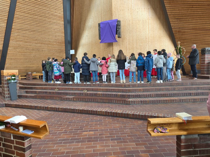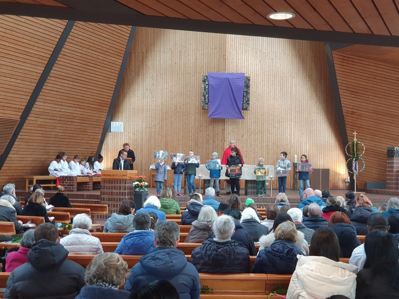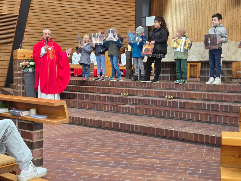 In der Kirche folgte die Passionsgeschichte, gelesen in verschiedenen Rollen und unterbrochen durch Lieder. Die Kinder ergänzten zum Text Bilder einer Kinderbibel.