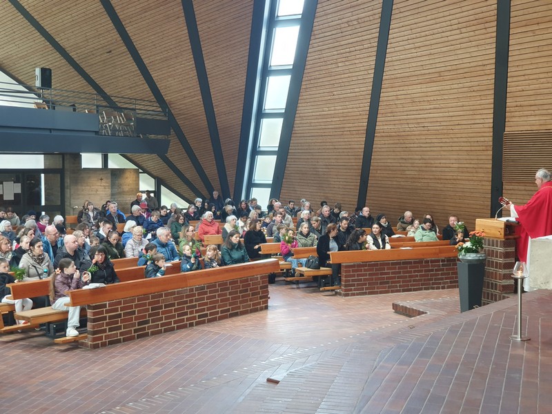 Am Palmsonntag, 29. März 26, begann der Gottesdienst im Freien. Die Palmzweige wurden gesegnet und das Evangelium nach Matthäus erzählte den Einzug Jesus nach Jerusalem, den dann symbolisch auch die Gemeinde vollzug, indem sie in die Kirche einzog.
