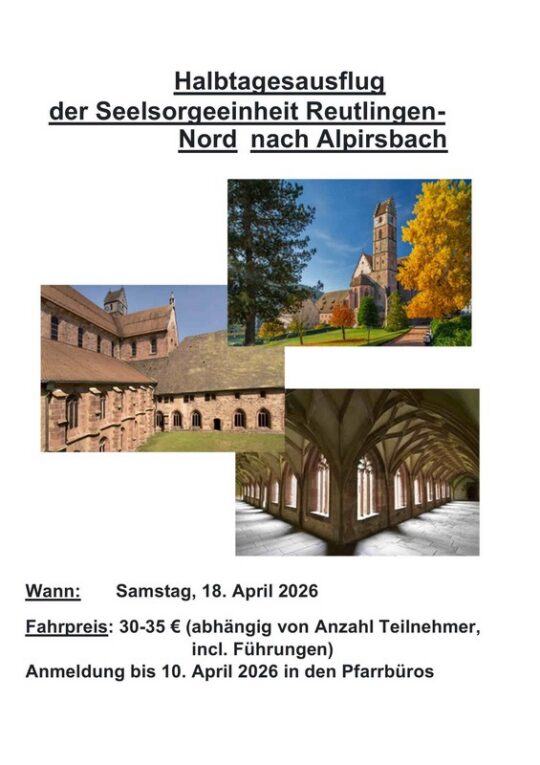 Halbtagesausflug der Seelsorgeeinheit Reutlingen-Nord 2026 zum Kloster Alpirsbach und Ganztagesausflug ins Elsass